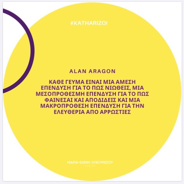 ΚΑΘΕ ΓΕΥΜΑ ΕΙΝΑΙ ΜΙΑ ΑΜΕΣΗ ΕΠΕΝΔΥΣΗΓΙΑ ΤΟ ΠΩΣ ΝΙΩΘΕΙΣ, ΜΙΑ ΜΕΣΟΠΡΟΘΕΣΜΗΕΠΕΝΔΥΣΗ.ΓΙΑ ΤΗΝ ΕΛΕΥΘΕΡΙΑ ΑΠΟ ΑΡΡΩΣΤΙΕΣ.~Alan Aragon