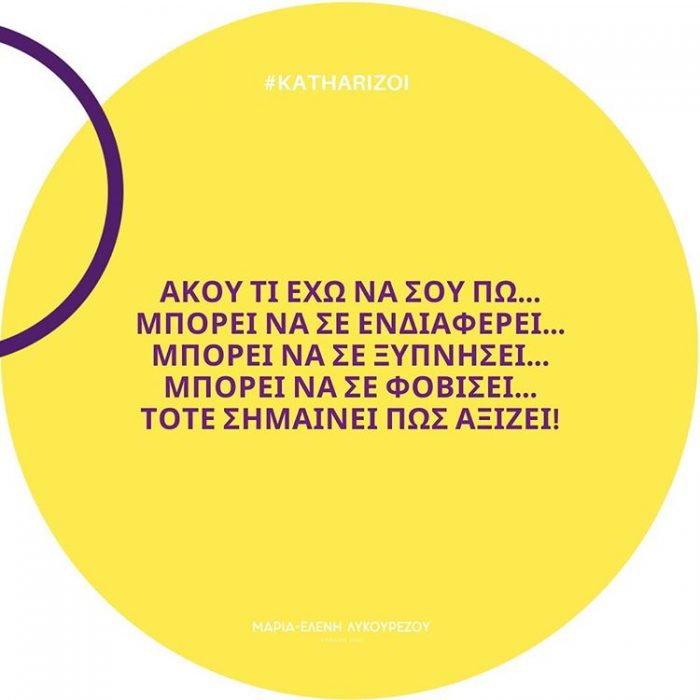 Χρειάζεται να ενδιαφερθούμε για μας πρώτα! Εγωιστικά ναι. Αν με αγαπώ! Θα μιλήσω. Θα εκφραστώ. Θα συζητήσω και ας μην αρέσει στον άλλον/η. Χρειάζεται αυτοί που είναι δίπλα μας να σέβονται αυτά που θέλουμε να εκφράσουμε! Αλλιώς ας μην είναι δίπλα μας. Ντρεπόμαστε να μιλήσουμε μήπως και αν ο άλλος/η παρεξηγηθεί! Ας παρεξηγηθεί. Ας ενοχληθεί. Θα το ξεπεράσει. Αυτό όμως που μπορεί να μην ξεπεραστεί ποτέ είναι να αρρωστήσουμε λόγω του ότι δεν μιλάμε. Οι περισσότερες ασθένειες ξεκινούν από μια μεγάλη θλίψη, πόνο και από το ότι δεν τα λέμε! Σοβαροφάνεια χωρίς λόγο. Ας μάθουμε λοιπόν να τα λέμε άλλοτε ήρεμα, άλλοτε πιο έντονα….. Τι είδους σχέσεις θέλουμε? Τι ανθρώπους θέλουμε δίπλα μας? Θέλουμε ανθρώπους που να ακούνε……. Πλέον οι περισσότεροι δεν ακούνε….Άκου τι έχω να σου πω….. Μπορεί να σε ενδιαφέρει…. Μπορεί να σε ξυπνήσει..